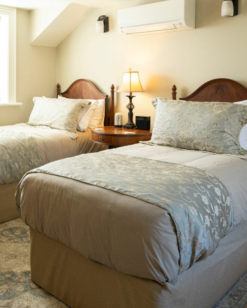 The Jane Owen room, nestled on the north side of the original building, offers views of both the north tower. Accessible via a private entrance and a narrow, steep set of stairs, this cozy hideaway features a gas fireplace, a double rain shower and a single soaker tub. Perfect for a girl’s trip, it includes two single beds and a beautiful ensuite bathroom.