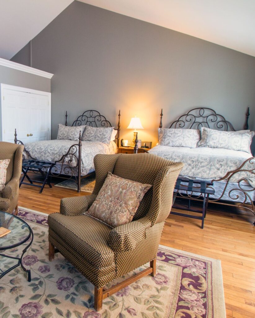 The Sentosa Spa Cottage is located just a quarter kilometre east of the Main Inn, nestled beside a tranquil freshwater pond. The Sentosa accommodations feature cathedral ceilings and a semi-private deck with stunning southern views of the Northumberland Hills and Lake Ontario. These charming triplex units share access to a spacious open-concept kitchen, dining room, living area, patio, and an inviting outdoor hot tub, offering a perfect blend of comfort and relaxation.