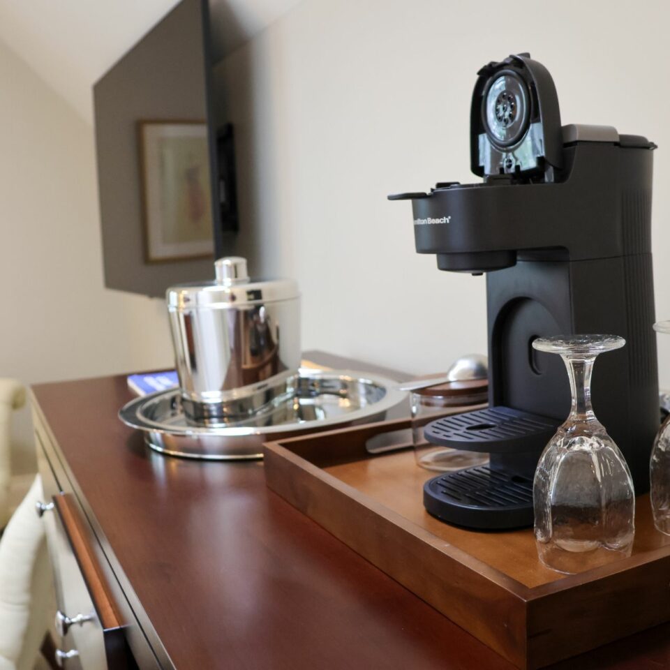 • Mini fridge and coffee maker with coffee and tea