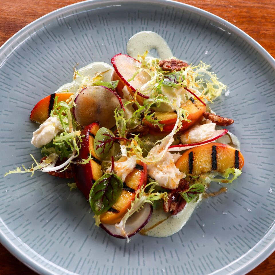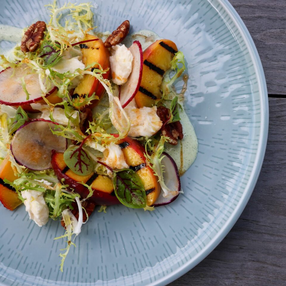 Ste. Anne’s Spa Chef Lucas’ Grilled Peach Salad recipe showcases juicy grilled peaches with creamy fior di latte and toasted pecans, all on a bed of crisp greens. Topped with a refreshing mint yogurt dressing and smoky chilli honey, this dish combines sweet, savoury and spicy notes for a delightful taste experience.