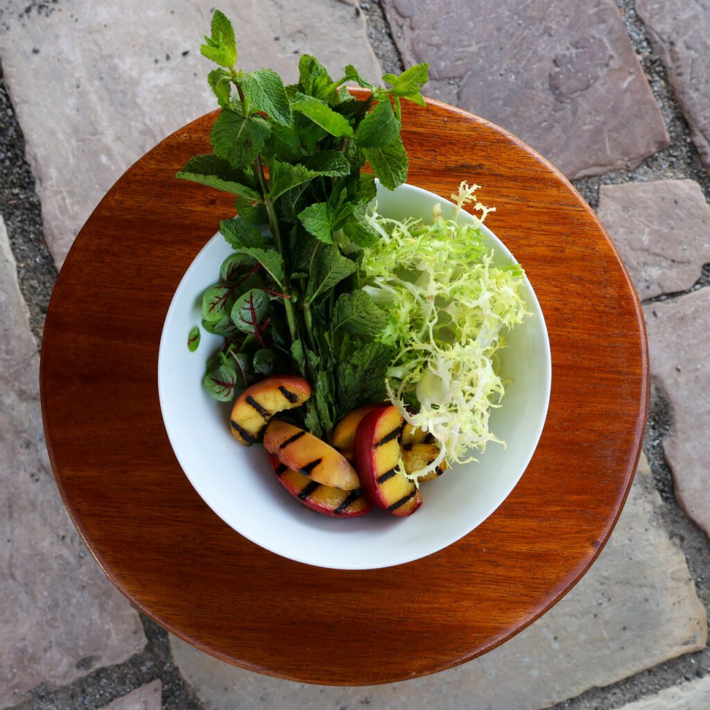 Ste. Anne’s Spa Chef Lucas’ Grilled Peach Salad recipe showcases juicy grilled peaches with creamy fior di latte and toasted pecans, all on a bed of crisp greens. Topped with a refreshing mint yogurt dressing and smoky chilli honey, this dish combines sweet, savoury and spicy notes for a delightful taste experience.