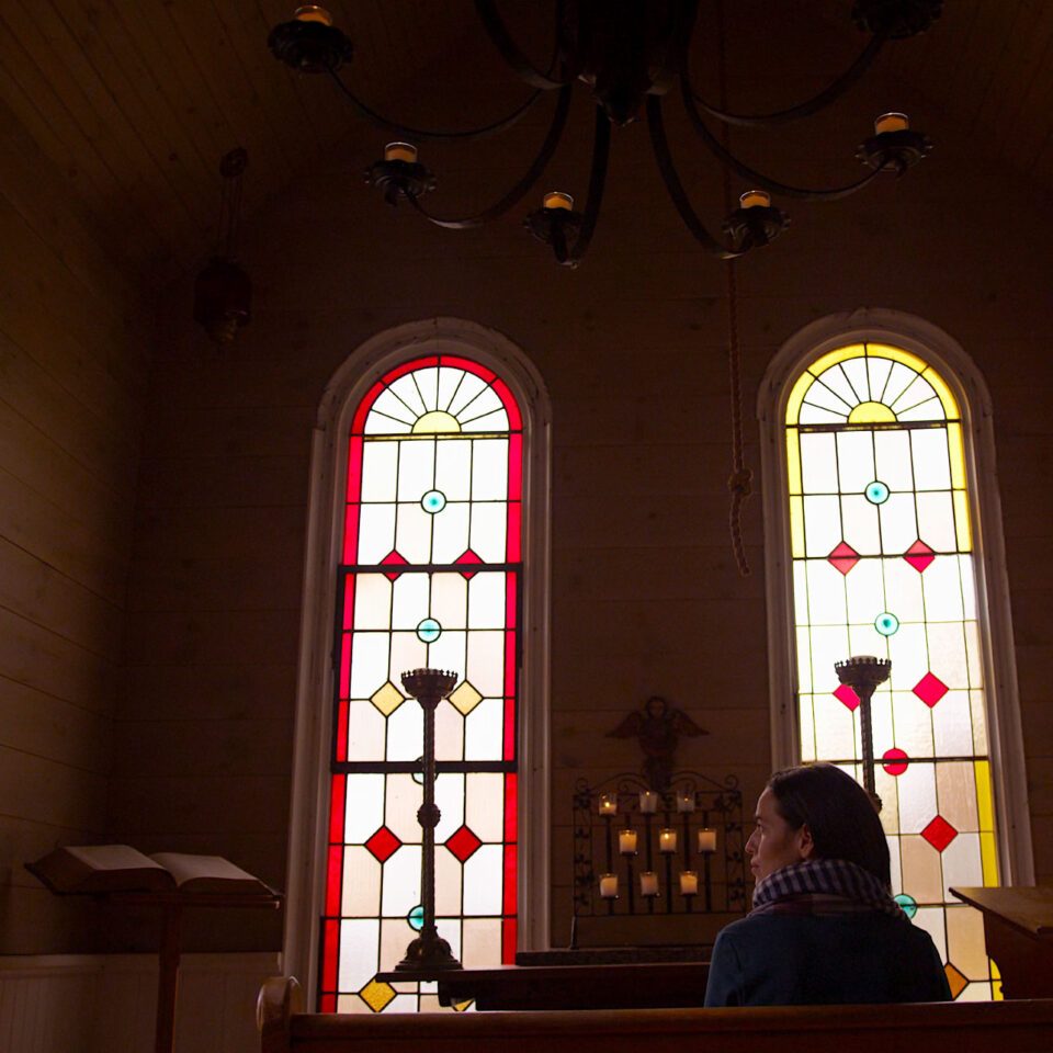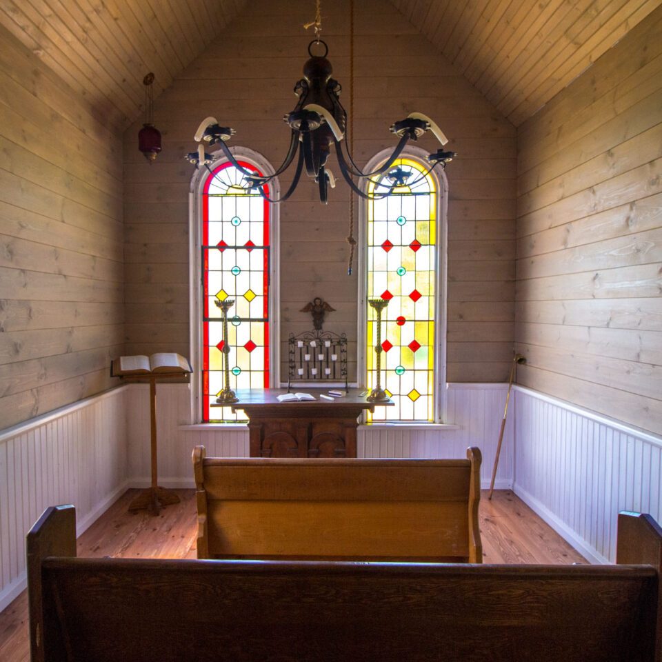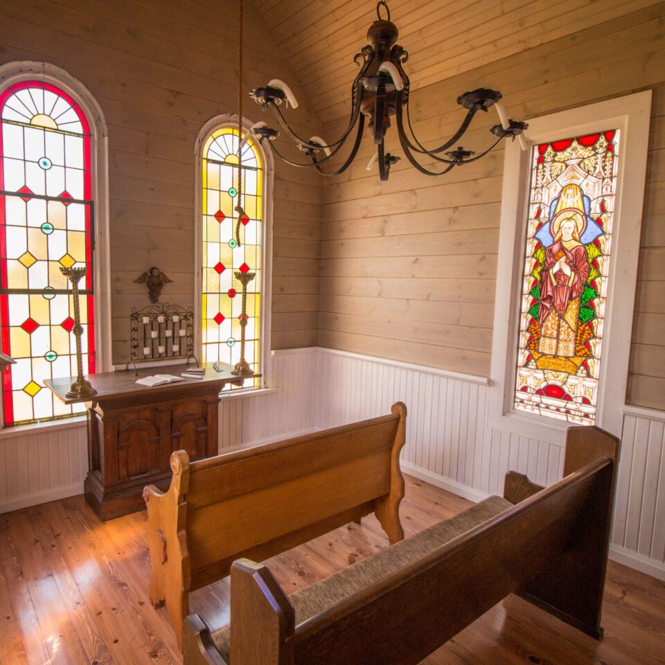The chapel features several wooden pews, stunning stained-glass windows, and an antique bell, creating a peaceful and sacred atmosphere. It can comfortably accommodate up to 8 guests.